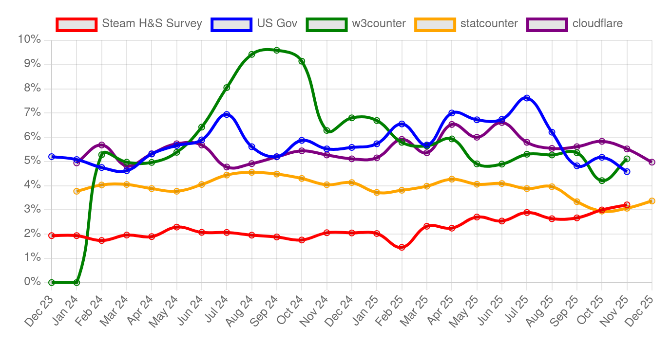 Now, overall, I believe that we can safely say that there's no visible upward trend in Linux market share. The only datapoint showing a stable increase is the Steam H&S Survey, which is probably driven by Steamdeck sales (thanks, Valve!).